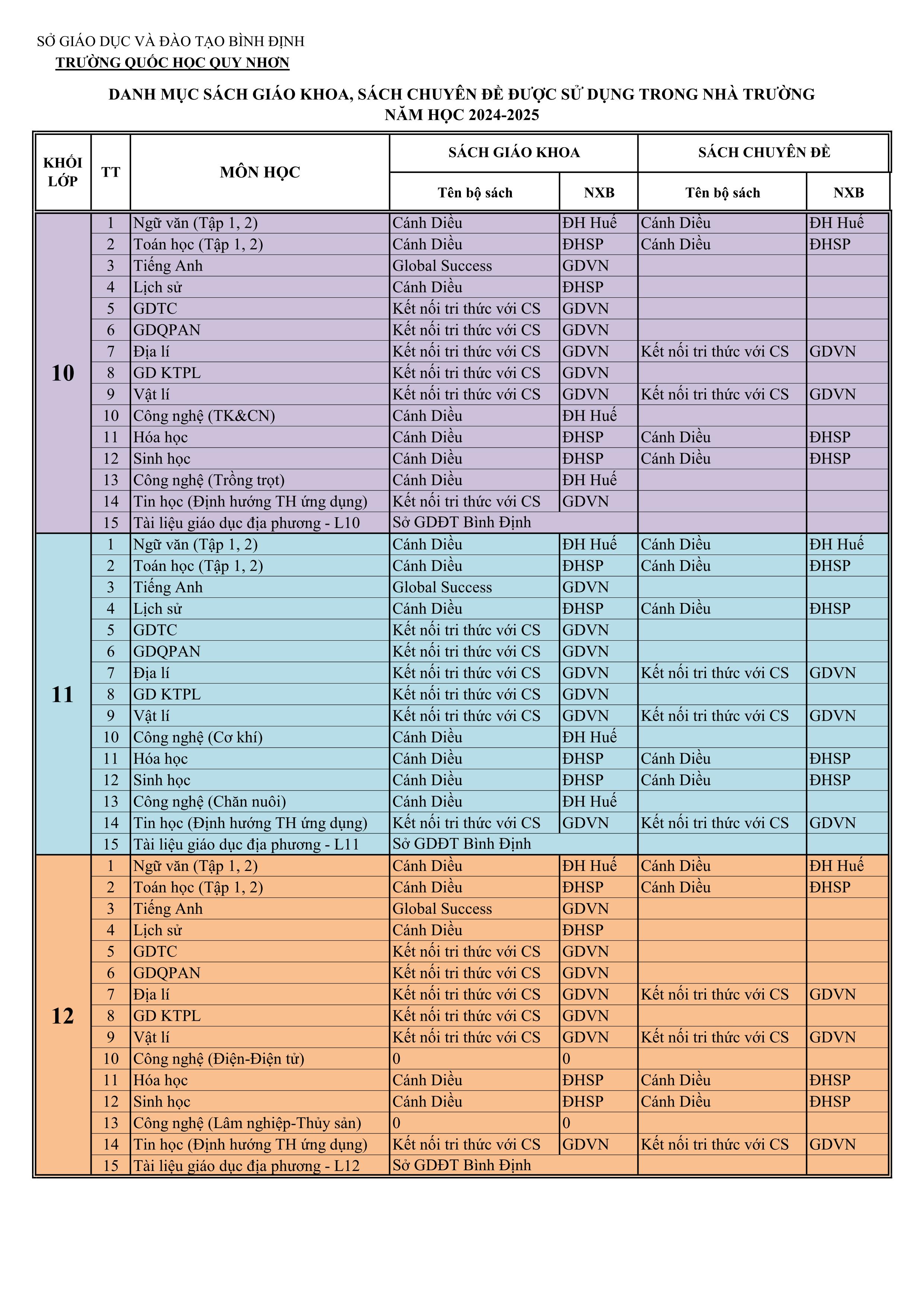 | Danh mục SGK và chuyên đề học tập năm học 2024-2025 |